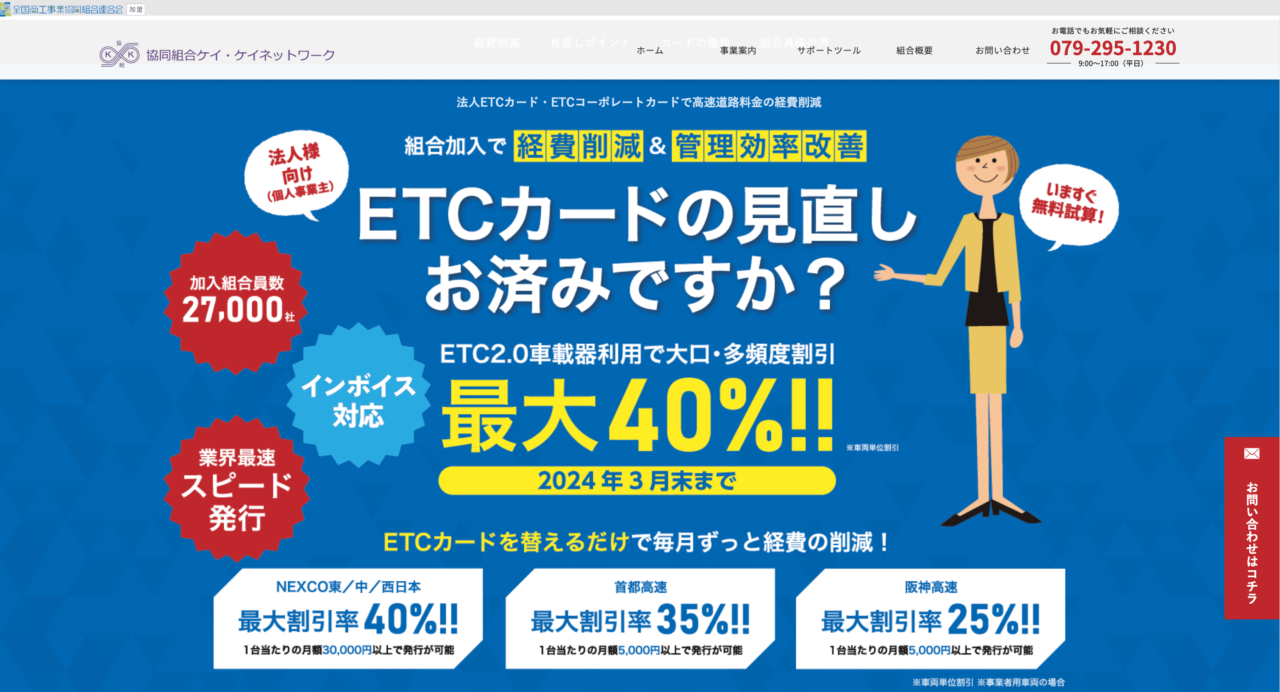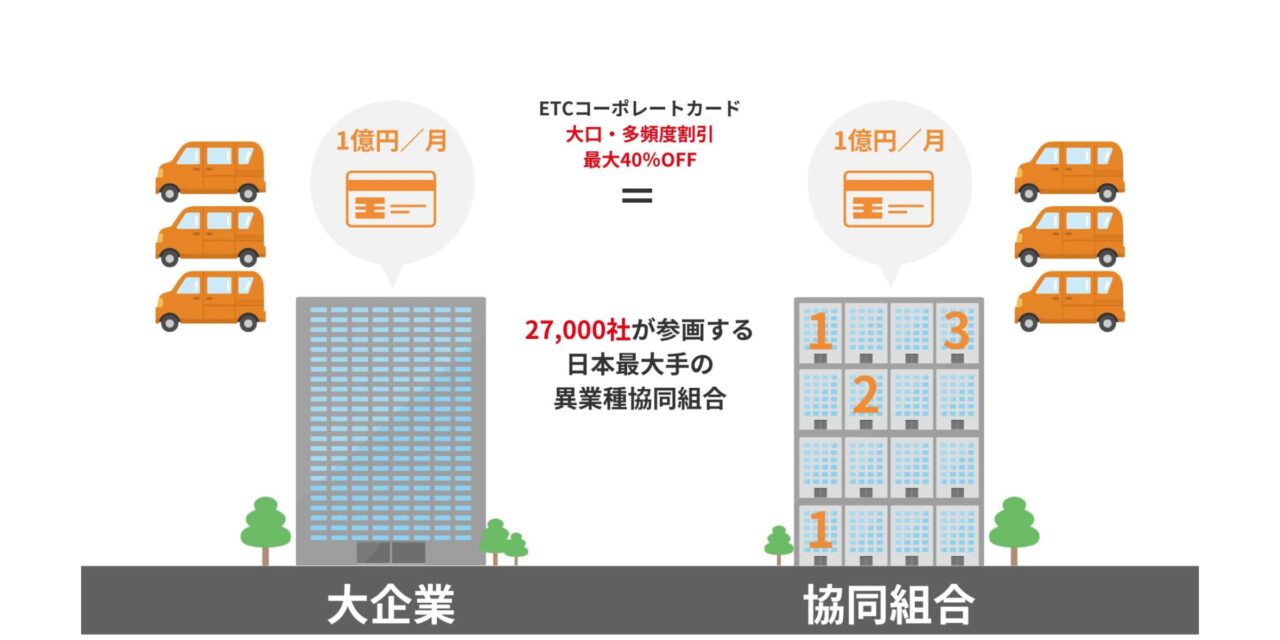 1社ずつでは使う金額は少なくても、協同組合として毎月1億円使うことができれば、ETCコーポレートカードの大口・多頻度割引で最大40%オフとなります。