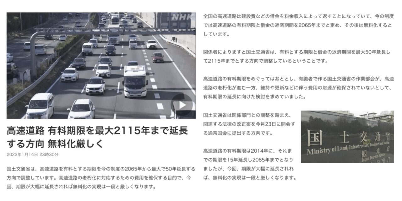高速道路の有料期限が最大2115年まで延長する、というニュースです。