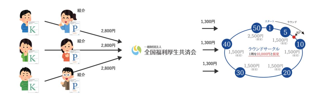 全厚済はP会員からの紹介でしか登録できないため、国民はP会員を探し、P会員はK会員として登録したい国民を探す。