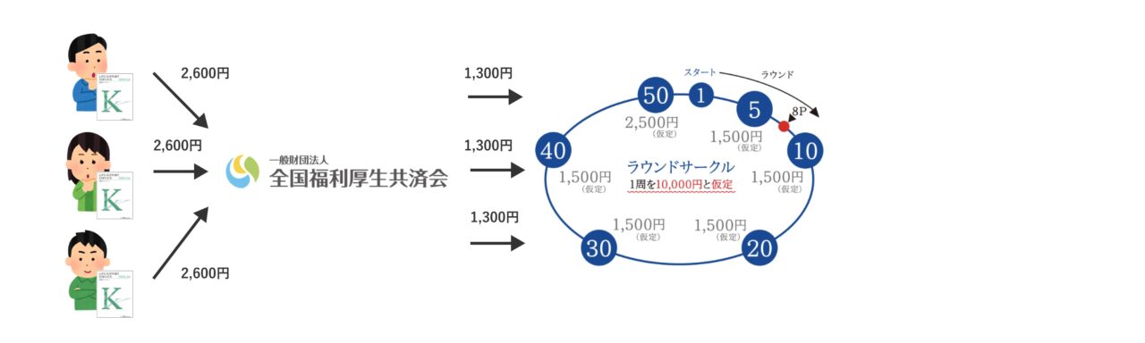 K会員が増えると、ラウンドコミッションのもとになるお金(1,300円)が増える。