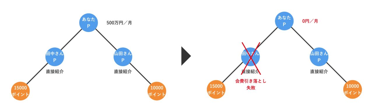 ラウンドコミッションの受領条件を満たさず、あなたのポイントは0ポイントとなり、月収500万円の成果報酬も0円になってしまいます。