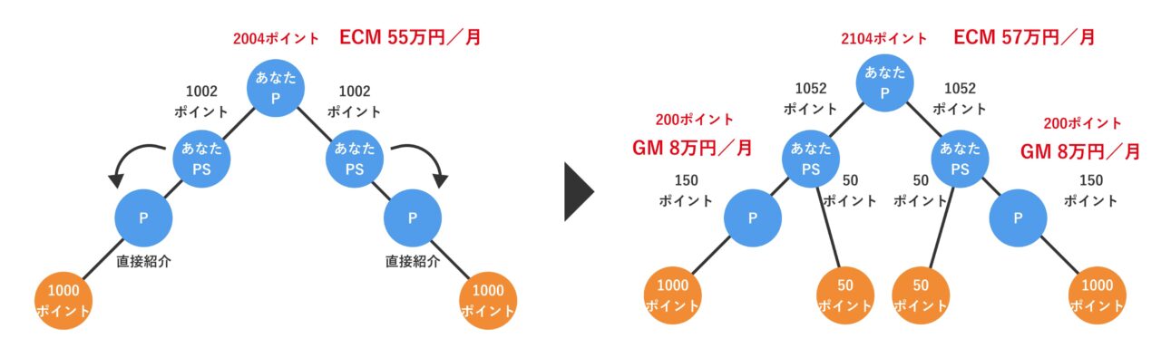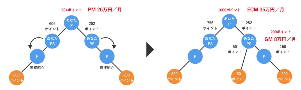 PS会員の共通ラインに大きなチームができると、2口目・3口目の片側50ポイントを集めることで、2口目・3口目がGMとなります。