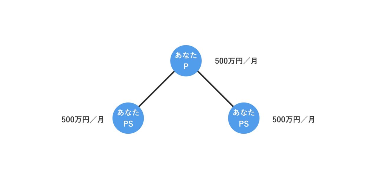 あなたが複数口登録をせずに、左に田中さん、右に山田さんを直接紹介し、そこから大きなチームになり、あなたが月収500万円の成果報酬を得られるようになった場合(直接紹介は田中さん・山田さんの2人のみ)