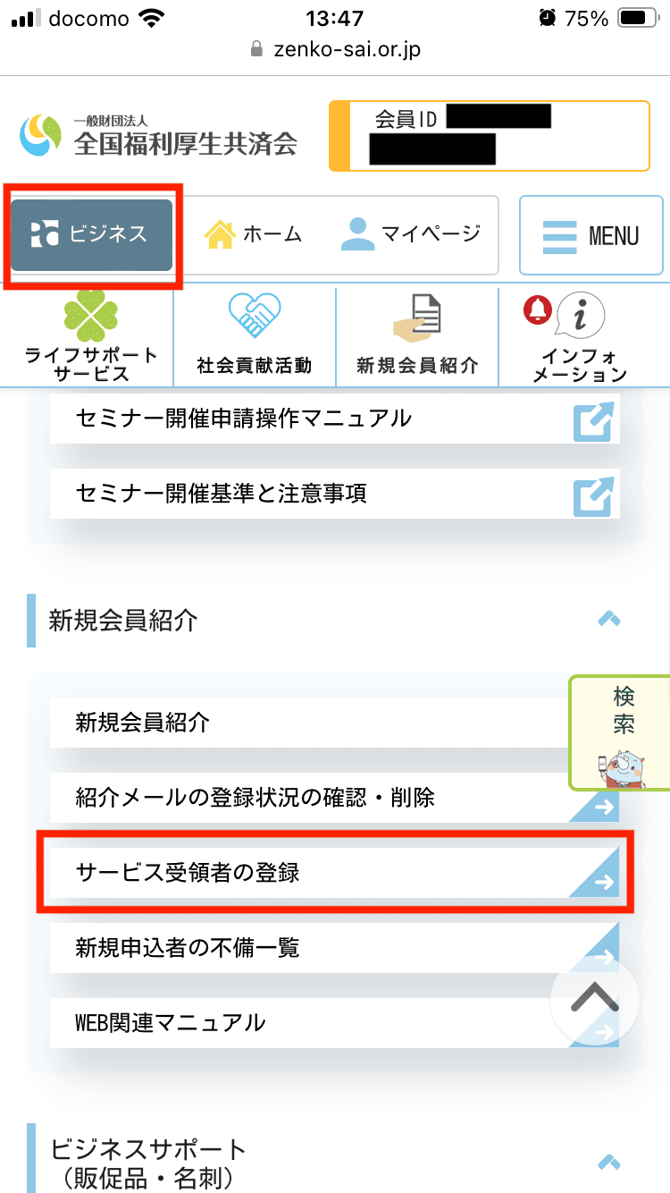 「ビジネス」の「サービス受領者の登録」をタップする。