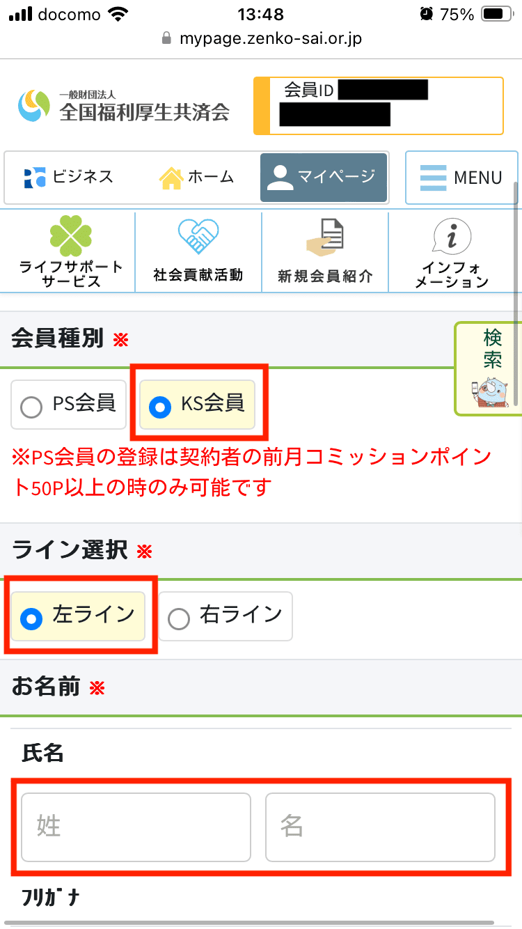 会員種別を「KS会員」、ライン選択を「左ライン」とする。