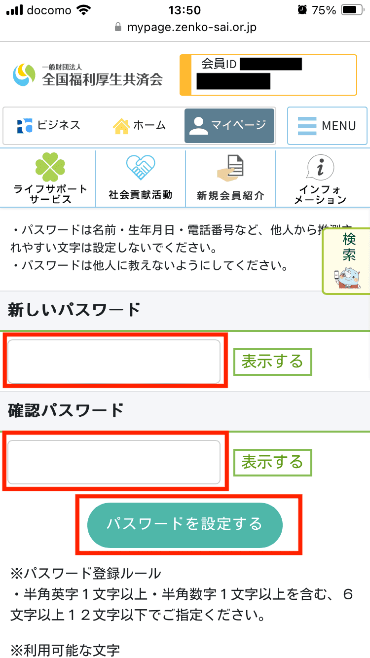 パスワードを2回入力し、「パスワードを設定する」をタップする。