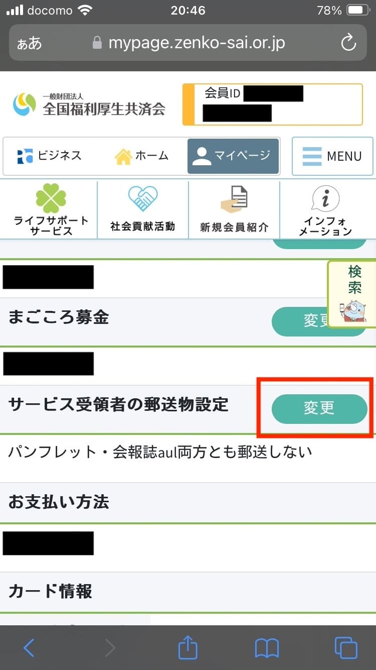 「サービス受領者の郵送物設定」の「変更」をタップする。