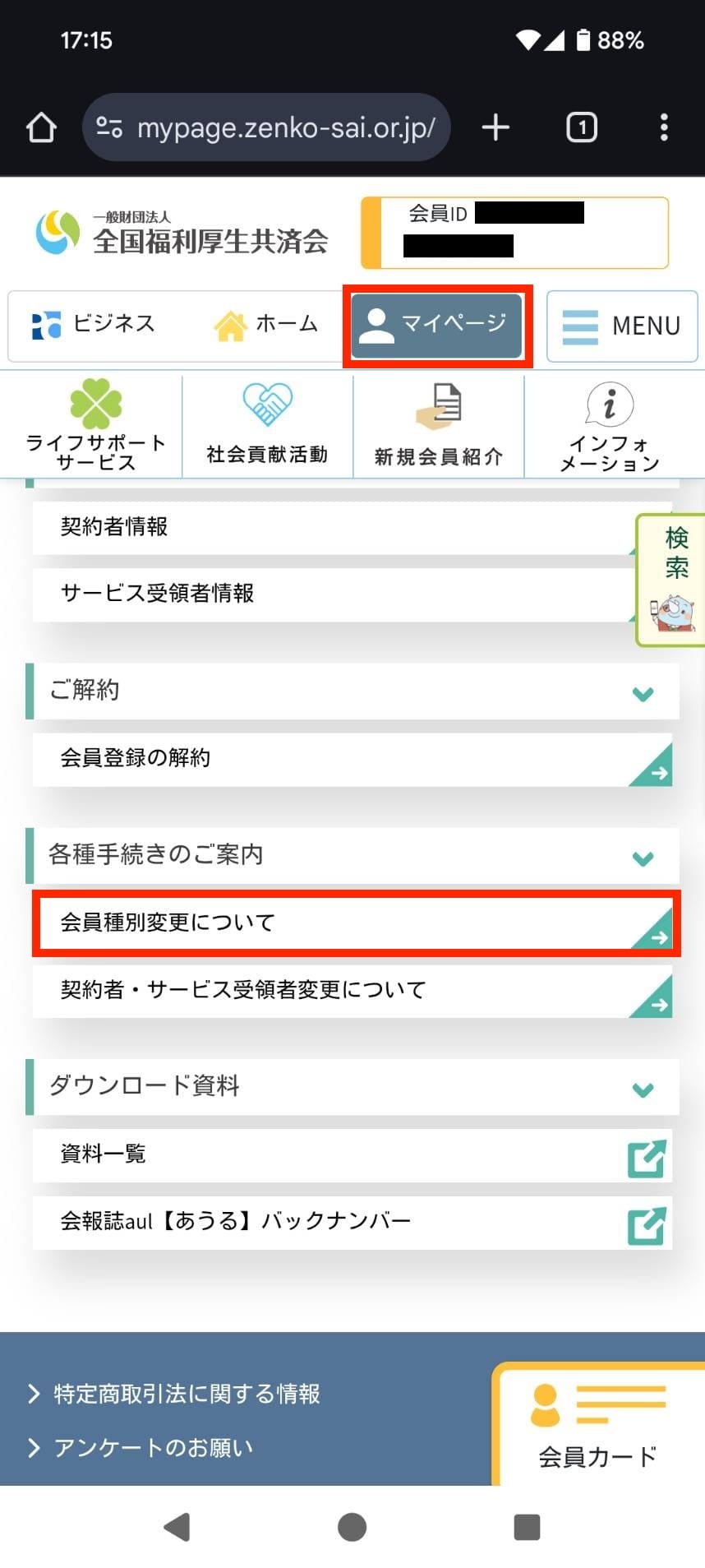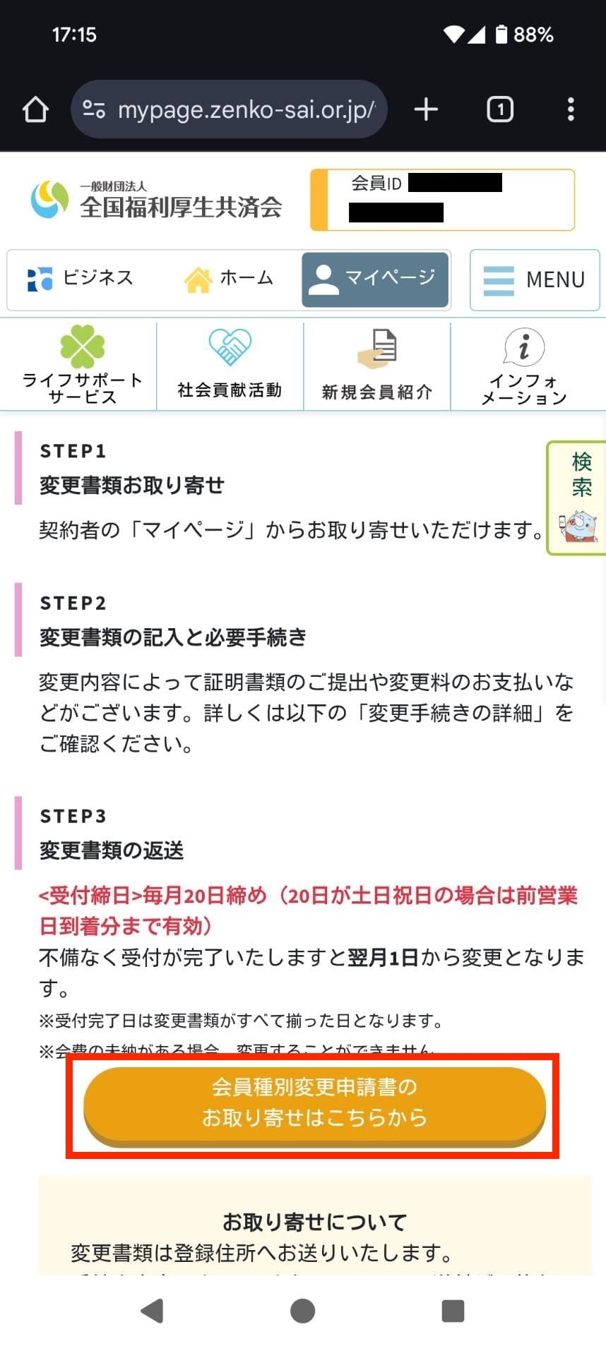 「会員種別変更申請書のお取り寄せはこちらから」をタップする。