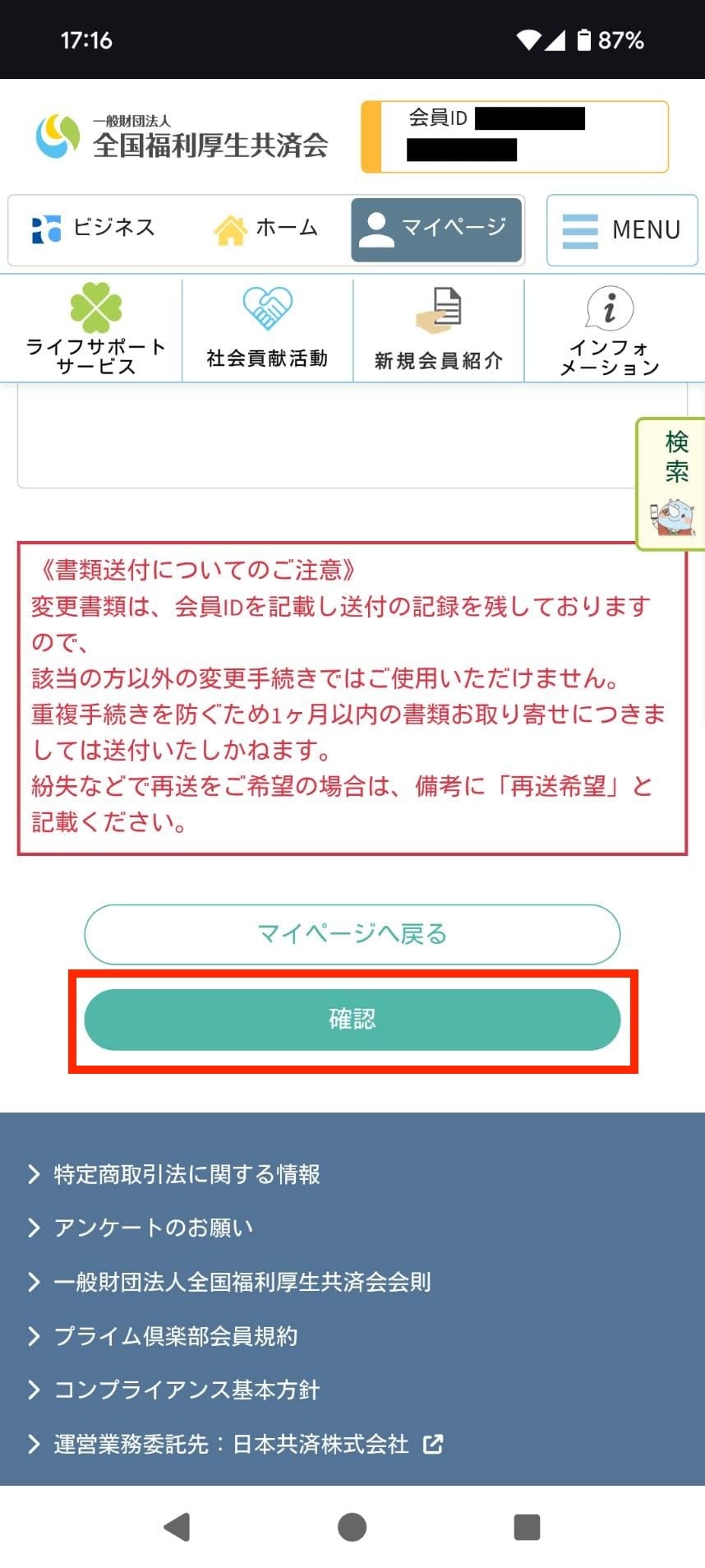 「変更をする会員」「変更内容」「書類送付方法」を入力し、「確認」をタップする。
