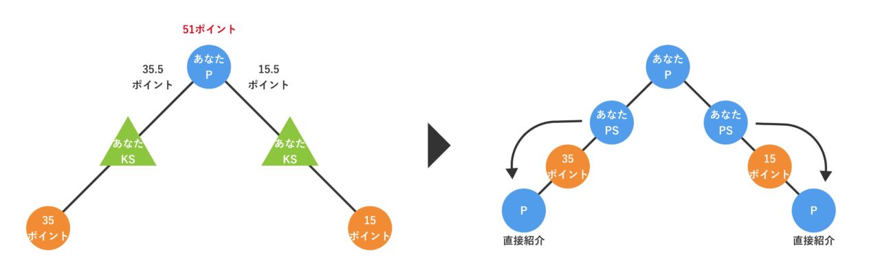 P会員のポジションが1:3で50ポイント以上になると、KS会員をPS会員に変更できます。