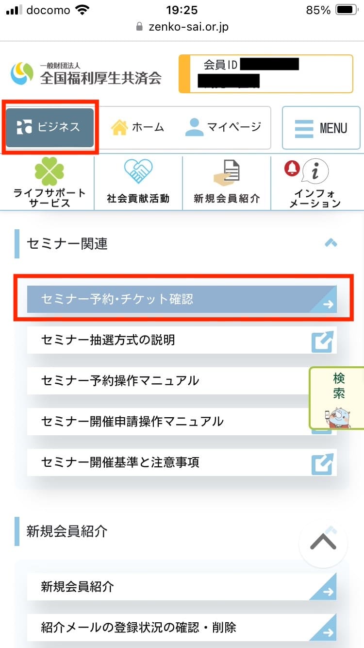 「ビジネス」の「セミナー予約・チケット確認」をタップする。