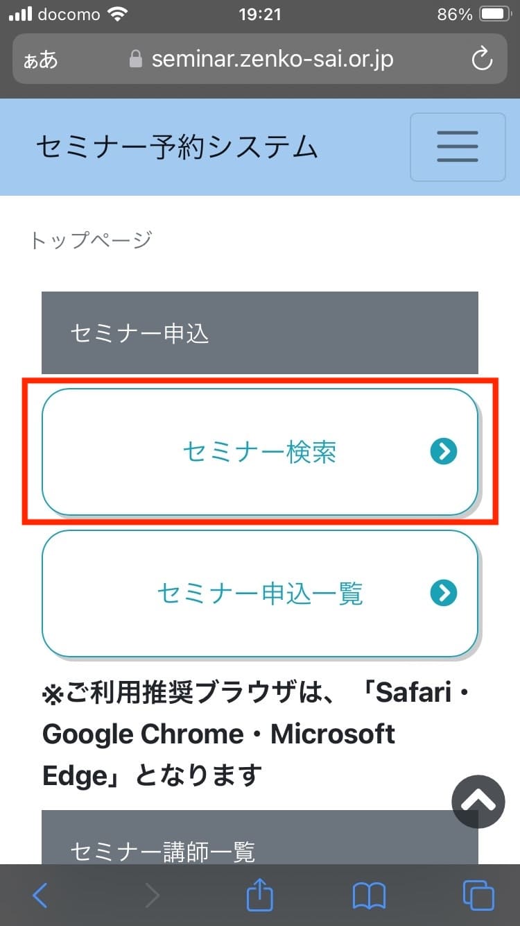 「セミナー検索」をタップする。