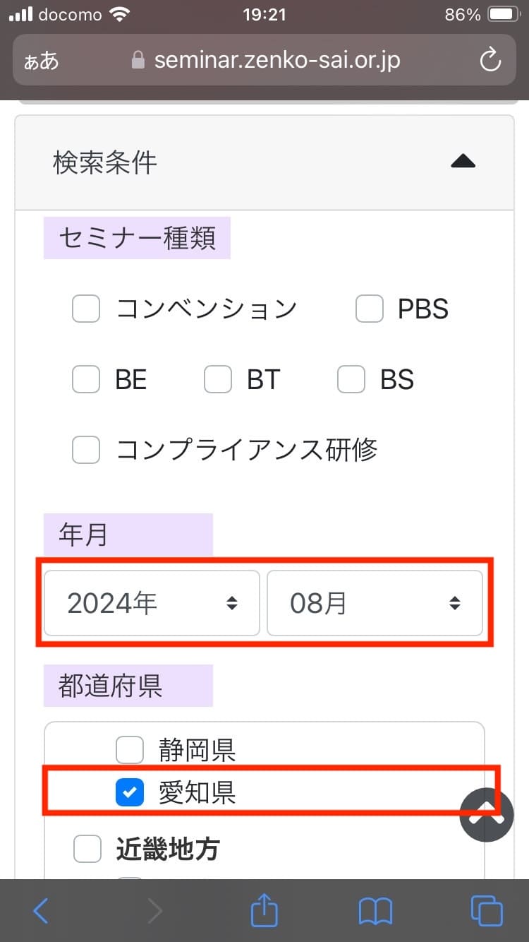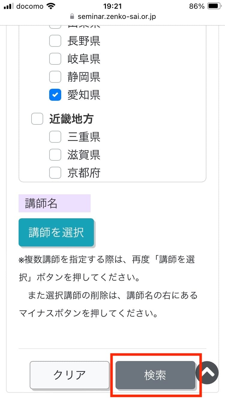 年月や都道府県(複数選択可能)で絞り込みして、「検索」をタップする。